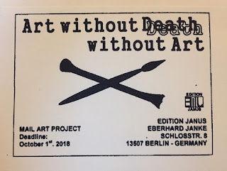mail art topic, format free as long as can be sent by post,  and there will be a catalog on-line with participants. send by 19.9.2018.