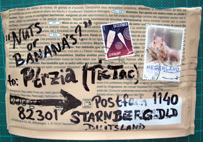 one of Heleen's awesome banana illustrations, a painted card with stamp and matching envelope together with an add-on and mail art stickers. a happy banana day!